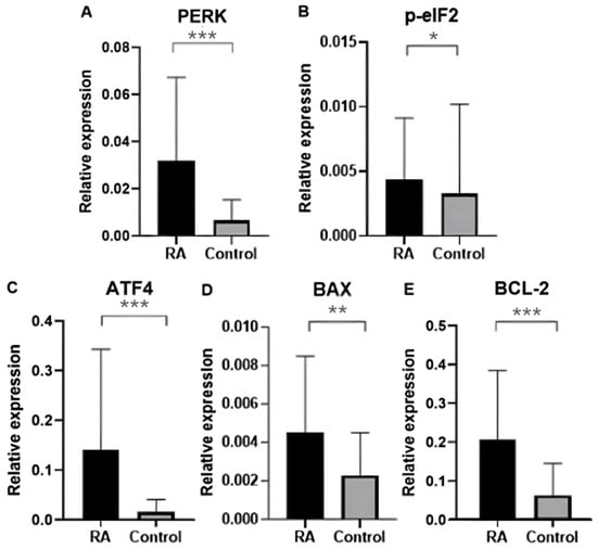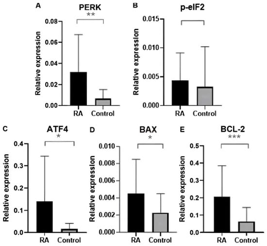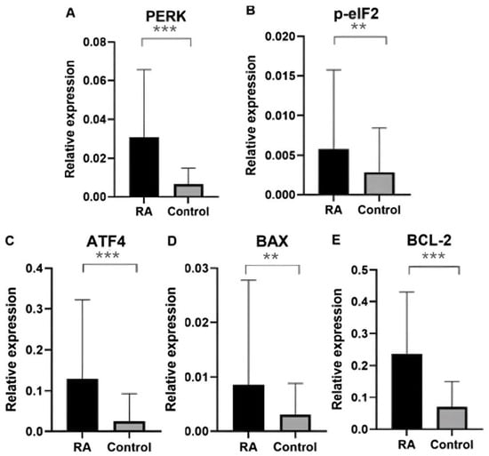 The etiology of RA is not fully understood, and it has been suggested that its development is influenced by genetic factors. The heredity of rheumatoid arthritis is estimated to be 66%. There is an increased risk of developing rheumatoid arthritis in first-degree relatives. The presence of the disease in a parent increases the risk of its development in a child by 2–5 times []. Genome sequencing revealed the association of many genes with an increased risk of disease development []. In this study, expression analysis was performed for genes of PERK, BCL-2, p-eIF2, ATF4, and BAX in the blood of RA patients compared with healthy individuals.