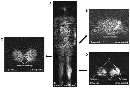 Representative images of whole-body positron emission tomography (PET) from a hemiparetic participant. (A) The coronal PET image (middle) is captured 6 cm in front of the subject’s posterior, depicting minimal [18F]fluoro-2-deoxy-D-glucose ([18F]FDG) uptake in the muscles of the affected (right) lower limb and elevated [18F]FDG uptake in the muscles of the unaffected (left) lower limb. This image provides an anterior–posterior view. (B) PET image in the axial plane of the pelvis showing reduced [18F]FDG uptake in the gluteus minimus muscle of the affected (right) lower limb. This image provides an inferior–superior view. (C) Axial PET image of the thigh showing increased [18F]FDG uptake in the medial hamstring muscle of the unaffected (left) lower limb. (D) Axial PET image of the lower leg showing reduced [18F]FDG uptake in the muscles of the affected (right) lower limb. TA, tibialis anterior muscle; TP, tibialis posterior muscle. Reproduced from [31], copyright © 2015, The Tohoku Journal of Experimental Medicine.