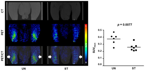 Comparison of [18F]FCH uptake by hindlimb skeletal muscle of control rats (UN) and rats in which muscle atrophy was induced by starvation (ST). Muscle atrophy model rats exhibited significantly lower [18F]FCH uptake than that of the control group. Choline uptake in atrophic muscle tissues was assessed using PET/CT with [18F]FCH. The volume of interest (VOI; white arrows) indicates both hindlimbs. The graph indicates the SUVmean in the VOI of the control (UN, n = 6) and starvation groups (ST, n = 7). CT, computed tomography; PET, positron emission tomography; SUVmean, mean standardized uptake value; Reproduced from [13], copyright © 2022, Diagnostics.