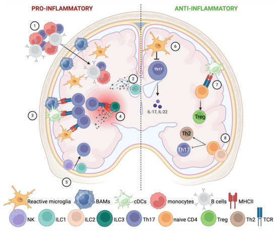 Involvement of CNS resident innate immune cells in neuroinflammation. CNS resident innate immune cells can both boost and fight against neuroinflammation. The left side of the image represents their pro-inflammatory potential (1–5), while on the right side, it is depicted as their anti-inflammatory role (6–8). Left side: (1) Microglia and meningeal macrophages recruit peripheral inflammatory cells into the CNS. (2) ILC1s in the choroid plexus favor the entry of peripheral inflammatory cells through the expression of IFN-γ and TNF-α. (3) Microglia, BAMs, and resident cDCs foster T-cell activation through overexpression of MHC-II and co-stimulatory molecules. (4) ILC3s act as APCs to autoimmune T cells in focal lesions of the CNS parenchyma. Furthermore, accumulated ILC3s release pro-inflammatory cytokines such as IFN-γ, IL-17, and GM-CSF, which boost chronic inflammation. (5) NK and ILC1 favor the recruitment of inflammatory Th17. Right side: (6) Microglia can phagocytose and kill CNS-infiltrating Th17 cells, counteracting inflammation. (7) After the disease onset, cDCs prime the development of regulatory T cells instead of Th17. (8) ILC2 switch the differentiation of CD4+ T cells into Th2, at the expense of Th17 activation.