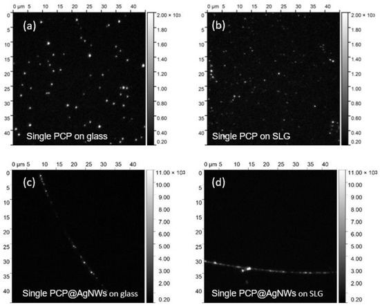 Wide-field fluorescence images measured for single-PCP complexes: (a) on glass; (b) on graphene; (c) conjugated with AgNWs on glass; and (d) conjugated with AgNWs on graphene. The corresponding optical transmission images are included in the Supplementary Material (Figure S2). The intensity scale is different for the data obtained with and without the AgNWs.