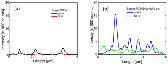 The intensity profiles are as follows: (a) single PCP on glass (black) and graphene (red), (b) single PCP conjugated with AgNWs on glass (blue) and graphene (green). The profiles for (b) were made along AgNWs.