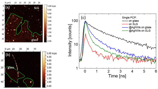 In addition to the changes in the fluorescence intensity of emitters, coupling with plasmonically active nanomaterials may result in reduction in fluorescence decay times due to increase in radiative rate [42]. Similarly, the energy transfer also may cause the shortening of the decay time due to the emergence of new non-radiative recombination channels [42]. Therefore, a spatially and time-resolved fluorescence experiment needs to be carried out for a complete picture of the spectroscopic properties of complex hybrid nanostructures, where the graphene-induced quenching competes with plasmonic enhancement. For that purpose, a TCSPC method adapted to a confocal microscope was used. For every sample, the experiment was performed in the following sequence: first, a fluorescence intensity map was registered to determine the positions of either silver nanowires, graphene flakes, or both on the sample surface. In the next step, fluorescence decays were acquired for tens of emission spots measured for each out of four studied hybrid nanostructures. In Figure 4a and Figure 4b, respectively, we show the typical fluorescence intensity maps of single PCP complexes in a PVA matrix and single PCP complexes conjugated with silver nanowires. As the samples were prepared on substrates, where flakes of monolayer graphene were present, the proper selection of the area of the sample allows for the direct comparison of fluorescence intensity and the decay for PCP complexes coupled and uncoupled to the graphene. The boundaries of graphene in Figure 4a,b are marked with green lines. The fluorescence intensity map for highly diluted PCP complexes in a PVA matrix (Figure 4a) features well-separated spots, some of which—characterized with rather high intensities—are most probably due to PCP aggregates. In contrast, on graphene, the number of high-intensity emission spots is noticeably smaller, and the intensities are also less than for PCP placed on glass. This result is in qualitative agreement with the observations made using wide-field fluorescence microscopy. In the case of PCP complexes conjugated with silver nanowires, as presented in Figure 4b, a major part of the nanowire is located on graphene, with just one end lying on the glass. The difference in the intensity of PCP fluorescence between glass and graphene is, in this case, less noticeable.