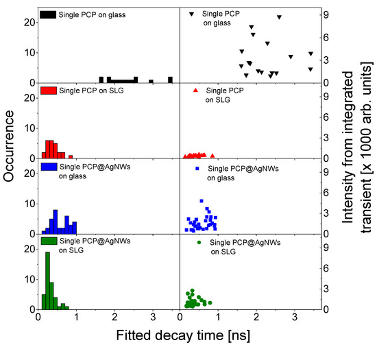 Histograms of fitted average fluorescence decay times (left), integrated fluorescence intensity-average fluorescence decay time correlation plot (right). The data are marked as follows: single PCP on glass (black) and on graphene (red); single PCP@AgNWs on glass (blue) and on graphene (green).