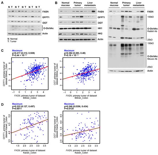 2.2. The Level of FASN Correlates with Expression of GFPT1 and OGT as well as the Level of O-GlcNac on Proteins in Human CRC Specimens