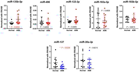 At the laboratory level, quantitative real-time PCR was also conducted to verify the expression of seven miRNA candidates in normal and AVM groups. Specifically, the relative expression levels of miR-135b-5p were remarkably increased (p-value = 0.0253) in the AVM group compared to the normal group. Conversely, the relative expression levels of miR-137 were significantly decreased (p-value = 0.0238) in the AVM group (Figure 1). Thus, we identified that among the seven miRNA candidates, miR-135b-5p and miR-137 were significant in the AVM group compared with the normal group.