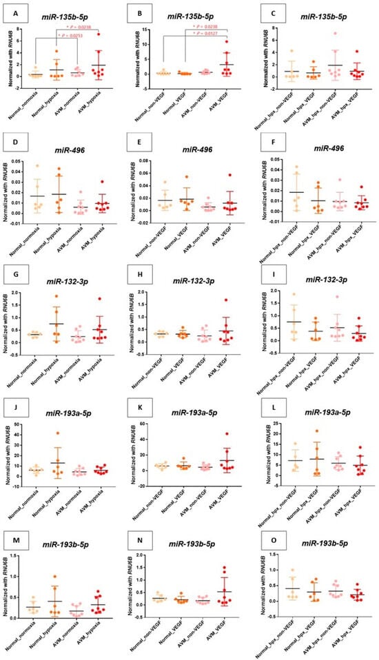 Comparing groups A, B, C, and D, hypoxic conditions were associated with increased endothelial activity in AVM when compared to the normal group, leading to a marked upregulation of miR-135b-5p (p-value = 0.0238) (Figure 2A).