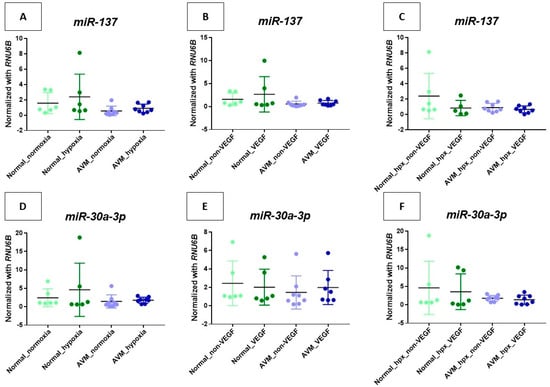 For the downregulated miRNAs, such as miR-137, group B revealed an increase compared to group A, whereas miR-30a-3p exhibited a decline, and both miRNAs showed a similar level of expression between groups E and F, neither of which reached statistical significance (Figure 3B,E).