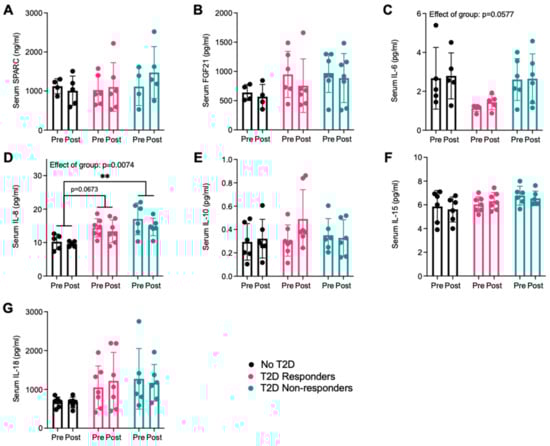 Variations in resting cytokine serum concentrations following the 10-week aerobic exercise intervention. (A) SPARC, (B) FGF21, (C) IL-6, (D), IL-8, (E) IL-10, (F) IL-15, and (G) IL-18 levels are presented before (pre) and after (post) the exercise intervention. IL-13 was undetected in almost all serum samples. No T2D = participants with obesity without T2D, T2D responders = patients with T2D who respond to training, and T2D non-resp. = patients with T2D who do not respond to training. N = 4–7. Data are represented as individual values and mean ± SD. ** p < 0.01.