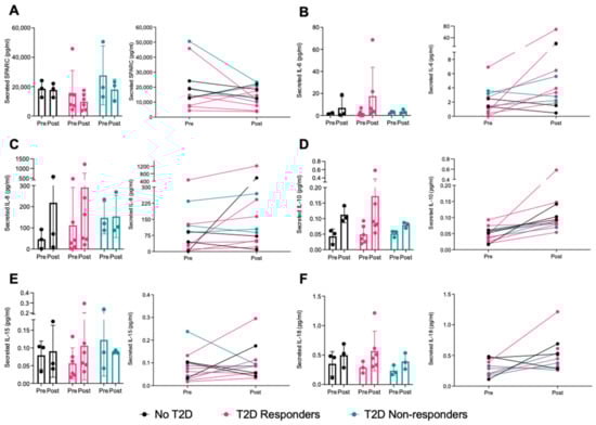 Variations in myokine secretion in cell-culture supernatant of human primary myotubes in response to the 10-week aerobic exercise intervention. Myokines were measured by R-plex and U-plex assays (MSD, Maryland, USA). (A) SPARC, (B) IL-6, (C) IL-8, (D) IL-10, (E) IL-15, and (F) IL-18 levels are presented before (pre) and after (post) the exercise intervention. BDNF, FGF21, and IL-13 were mostly undetected. No T2D = participants with obesity without T2D, T2D responders = patients with T2D who respond to training, and T2D non-resp. = patients with T2D who do not respond to training. N = 2–6. Data are presented as individual data points with mean ± SD and line graphs when applicable.
