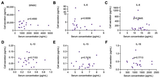 Correlation analysis between myokine secretion in cell-culture supernatant of human primary myotubes and serum concentrations of cytokines from the participants. Myokines were measured by R-plex and U-plex assays (MSD, Maryland, USA). (A) SPARC, (B) IL-6, (C) IL-8, (D) IL-10, (E) IL-15, and (F) IL-18 levels. N = 16–18. Data are presented as individual data points including pre- and post-intervention values per participant.