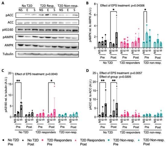 Effect of EPS on the phosphorylation of proteins involved in the AMPK pathway in human primary myotubes quantified by immunoblotting. NS = non-stimulated, E = electrode exposure, S = EPS treatment, Pre = pre-intervention, Post = post-intervention. (A) Representative blot, (B) quantification of p-AMPK relative to total AMPK, (C) quantification of p-AS160 relative to tubulin, and (D) quantification of p-ACC relative to total ACC. Blots were analyzed with ImageJ (NIH). No T2D = participants with obesity without T2D, T2D responders = patients with T2D who respond to training, and T2D non-resp. = patients with T2D who do not respond to training. N = 3–6. Data are shown as mean ± SD with individual data points. * p < 0.05, ** p < 0.01.