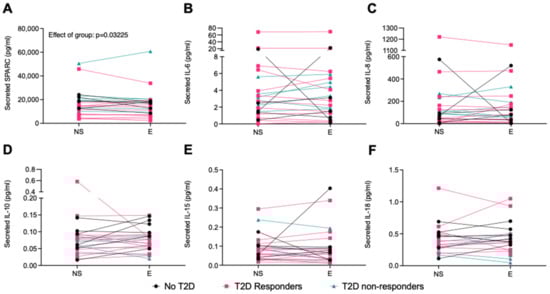 Effect of electrode-exposure control condition of human primary myotubes collected pre- and post-intervention on myokine secretion. Myokines were measured in the cell-culture supernatant by R-plex and U-plex assays (MSD, Maryland, USA). (A) SPARC, (B) IL-6, (C) IL-8, (D) IL-10, (E) IL-15, and (F) IL-18. BDNF, FGF21, and IL-13 were mostly undetected. No T2D = participants with obesity without T2D, T2D responders = patients with T2D who respond to training, and T2D non-resp. = patients with T2D who do not respond to training. Non-stimulated = NS, exposed to the electrode apparatus for 1 h = E. N = 6–12. Data are shown individually with lines connecting the NS and E conditions for one cell line.