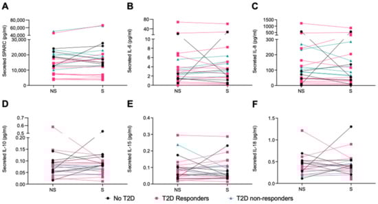 Effect of EPS treatment of human primary myotubes collected pre- and post-intervention on myokine secretion. Myokines were measured in the cell-culture supernatant by R-plex and U-plex assays (MSD, Maryland, USA). (A) SPARC, (B) IL-6, (C) IL-8, (D) IL-10, (E) IL-15, and (F) IL-18. BDNF, FGF21, and IL-13 were mostly undetected. No T2D = participants with obesity without T2D, T2D responders = patients with T2D who respond to training, and T2D non-resp. = patients with T2D who do not respond to training. N = 6–12. Data are shown individually with lines connecting the non-stimulated (NS) and EPS-stimulated (S) conditions for one cell line.