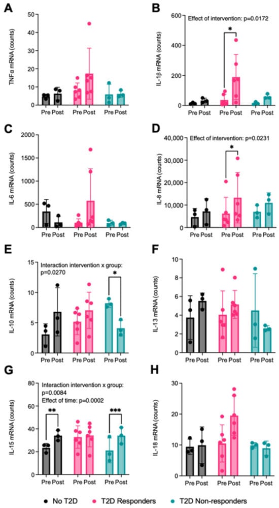 Gene-expression analyses of the NS condition of myotubes from the participant groups revealed a regulatory effect of both the exercise intervention and the groups on the expression of genes related to inflammation (Figure 7A–H). The level of mRNA expression increased between pre- and post-intervention in the T2D responders group for IL-1β (Figure 7B, p = 0.0116) and IL-8 (Figure 7D, p = 0.0114), as well as in the no T2D and T2D non-responders groups for IL-15 (Figure 7G, p = 0.0023 and p = 0.0007, respectively). An interaction between the effect of the intervention and the group was detected for IL-10 (p = 0.0270) and IL-15 (p = 0.0084) (Figure 7E,G). Levels of IL-10 mRNA were significantly decreased post- compared to pre-intervention in the T2D non-responders group (p = 0.0459), while IL-10 expression trended towards an increase post-intervention in the two other groups with no significance observed (Figure 7E). Although IL-15 mRNA levels significantly increased in the no T2D (p = 0.0023) and T2D non-responders groups (p = 0.0007), there was no change in the T2D responders group (Figure 7G).