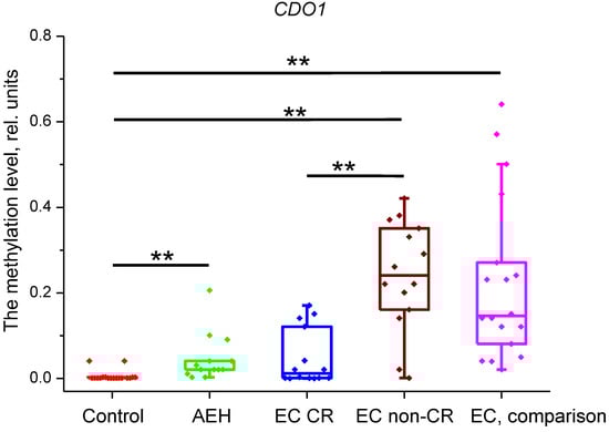 It was found that, in all groups, CDO1 methylation levels were significantly different from the control group (p < 0.001), except for the EC CR group (p = 0.21). The p-value for the difference between EC CR and EC non-CR groups was <0.001. Methylation levels were as follows: control group—0.001 (0.001; 0.003) rel. units; AEH group—0.021 (0.021; 0.041) rel. units; EC CR group—0.012 (0.001; 0.101) rel. units; EC non-CR group—0.241 (0.171; 0.346); and EC, comparison—0.146 (0.091; 0.263) rel. units (Figure 1).