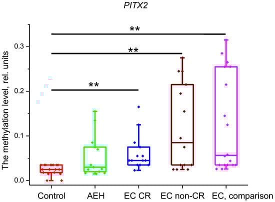 The assessment of PITX2 methylation level showed that all groups had statistically significant differences compared to the control group (p < 0.001) except for the AEH group (p = 0.21). For the difference between EC CR and EC non-CR groups, the p-value was 0.43. Methylation levels were as follows: control group—0.025 (0.018; 0.035) rel. units; AEH group—0.03 (0.02; 0.075) rel. units; EC CR group—0.045 (0.037; 0.07) rel. units; EC non-CR group—0.085 (0.035; 0.21); and EC, comparison—0.056 (0.035; 0.245) rel. units (Figure 2).