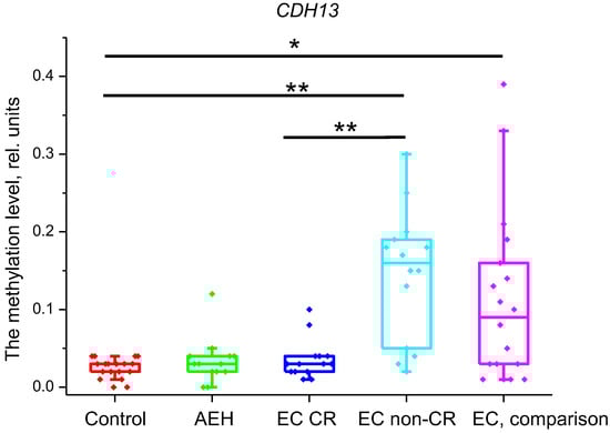 Methylation level of CDH13 gene in the studied groups. *—p < 0.05, **—p < 0.001. EC—endometrial cancer; AEH—atypical endometrial hyperplasia; CR—complete response.