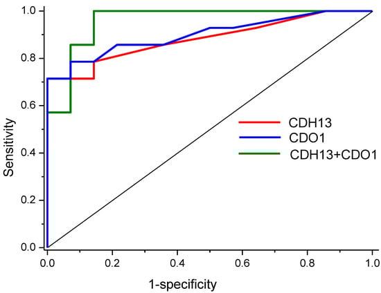 ROC analysis showed a high diagnostic value for the CDH13 gene, with AUC = 0.88 (0.75–1), and for the CDO1 gene, with AUC = 0.9 (0.89–1). Logistic regression for both genes showed AUC = 0.96 (0.89–1). ROC curves are presented in Figure 4.