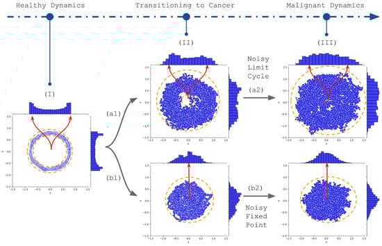 Extensive research has delved into the complexities of carcinogenesis, advancing discourses on driver and passenger mutations and the profound influences of epigenetics [,,]. In the intricate landscape of gene regulatory networks (GRN) dynamics, pivotal studies have elucidated the alignment between cell types or subtypes and stable states, often termed ‘attractors’ [,]. Concurrently, certain oscillatory cellular processes—integral to diverse functions such as circadian rhythms [], cell cycle progression [], and NF-B signaling in response to inflammation []—are closely tied to limit cycles in GRNs. Yet, the foundational principles guiding transitions between these states and the mechanisms by which a system traverses within an attractor’s domain—a notion sometimes framed as a ‘cancer attractor’ []—remain areas of active research.