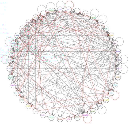 Our initial step was constructing a GRN, with the methodology outlined in Figure S3 (Supplementary Materials). This network, visualized in Figure 2, captures the intricate interplay among key genes and markers related to GBM subtypes. Primarily based on an initial list of GBM markers, the MetaCore platform autonomously expanded the network, ensuring an objective, bias-free augmentation. The resulting structure comprises 40 vertices and 242 edges: 187 activations, 11 self-activations, 41 inhibitions, and 3 self-inhibitions. Table S1 details the vertices, including those initially selected and those added by MetaCore.