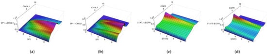 One of the results of the first and second estimations was the selection of the regulation function. The modified regulation function depends on the transcription factor and the regulated genes. The total number of regulatory functions equals the number of interactions in the network (242 interactions). After the parameters optimization, the best compatibility between experimental and simulated data was obtained with the regulation function of Equation (15). For example, Figure S11 (Supplementary Materials) shows the activation and inhibition regulation functions for some gene/transcription factor combinations. Each case presents a different relationship between the variables representing the amount of transcription factor mRNA and the activity of the gene promoter. Figure S11a,b correspond to the regulation functions of the first clustering choice, while Figure S11c,d to the second choice. Figure 3 displays some of these cases, such as the activation of CHI3L1 by SP1 and the inhibition of EGFR by STAT3. All surfaces were obtained with and , with (a) and (b) using and and (c) and (d) using and .