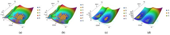 Qualitative changes can be observed due to the greater number of attractors in the NbC method compared to the k-means one, particularly in the dimensions CD44 × IDH1 (Figure 4a,b), CD44 × NEFL, and EGFR × IDH1, with the presence of new basins. When comparing these experimental landscapes to the simulated ones (Figure 4c,d), as expected from our previous discussion of Section 2.4.2, there are significant differences. The landscape is a precise structure that requires a high degree of correspondence between means, standard deviations, weights, and attractors. It is important to note that the experimental landscape does not consider dynamics and takes into account data points that may be in transient or metastable states. Regardless, the previous results are relevant and may indicate avenues for further improvements and studies on the system dynamics.