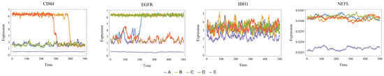 Trajectory plots for each basin (A, B, C, D, and E), showcasing the dynamics of the four marker genes (CD44, EGFR, IDH1, and NEFL). The trajectories illustrate the time evolution from initial conditions chosen as the centroid of the clusters found by the Gaussian mixture algorithm and using the parameters estimated from the k-means centroids. The horizontal axis represents time steps, and the vertical axis shows the expression level of each gene.