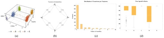 (a) Three-dimensional visualization of full trajectories in three of the markers space. All axes display the expression values of each marker gene. Each line represents an entire time of the three considered trajectories. Each color/letter indicates its respective basin. (b) Transition graph illustrating the connections between different basins. Vertices represent basins, and edge weights represent the probabilities of transitions between basins. (c) Frequency of transitions per trajectory. Histogram showing the frequency of transitions between basins in each trajectory, highlighting that most trajectories do not present any transition, and those that do tend to have a small number of transitions. The vertical axis shows the frequency of each number of transitions per trajectory, while the horizontal axis shows the number of transitions per trajectory. (d) Analysis of time spent in basins before a transition. Box plots reflect the distribution of time spent in each basin across all trajectories before they present a transition. The vertical axis represents the time spent in the basin, while the horizontal axis represents the correspondent basins.