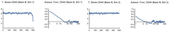 Autocorrelation analysis of time series data for CD44, basin B, and two simulations. Each pair of plots within includes a time series plot (left), with the horizontal axis representing time and the vertical axis representing expression values, and an autocorrelation plot (right) with the horizontal axis representing time lags and the vertical axis representing autocorrelation values.