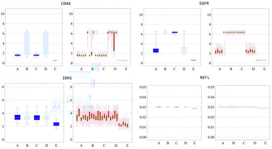 The dependence of the regulation function on the transcription factor can be seen along its axis, as affected by the contribution of the parameter f ( for activation and for inhibition) and the values . The dependence on the target gene is represented in the transverse direction to the transcription factor axis, where the maximum values for constant transcription factor concentration correspond to the centroid values observed in the experimental data. It is possible to observe how the peaks occur around the average values of CD44, CHI3L1, EGFR, and IDH1 for activation functions and CD44, EGFR, MDM2, and PGK1 for inhibition (Figure S11—Supplementary Materials).