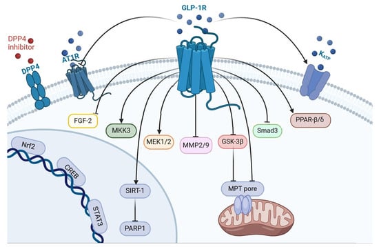 The mechanism of GLP-1-induced prevention of myocardial remodeling. DPP4, dipeptidyl peptidase 4; AT1R, angiotensin-1 receptor; GLP1R, glucagon-like peptide-1 receptor; KATP, ATP sensitive potassium channel; FGF-2, fibroblast growth factor-2; MKK3, mitogen-activated protein kinase kinase-3; MEK1/2, mitogen-activated protein kinase kinase-1/2; MMP2/9, matrix metalloproteinase 2/9; GSK3β, kinase glycogen synthase 3 β; Smad3, Suppressor of Mothers Against Decapentaplegic 3; PPAR-β/δ, peroxisome proliferator-activated receptor; Nrf2, nuclear factor erythroid 2-related factor 2; CREB, cAMP response element-binding protein; STAT3, signal transducer and activator of transcription 3; SIRT-1, silent information regulator-1; PARP1, poly(ADP-ribose) polymerase 1; MPT-pore, mitochondrial permeability transition pore.