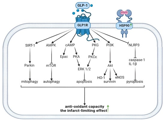 Antioxidant and infarct-limiting effect of GLP-1 receptor activation. Glucagon-like peptide-1 and regulated forms of cell death. GLP1, glucagon-like peptide-1; GLP1R, glucagon-like peptide-1 receptor; HSP90, heat shock protein 90; SIRT-1, silent information regulator-1; AMPK, adenosine monophosphate-activated protein kinase; cAMP, cyclic adenosine monophosphate; PKG, protein kinase G; PI3K, phosphoinositide 3-kinase; NLRP3, (NOD)-Like Receptor with a Pyrin domain 3; mTOR, mammalian target of rapamycin; Epac, exchange protein activated by cAMP-1; PKA, protein kinase A; PKCε, protein kinase Cε; ERK1/2, extracellular signal-regulated kinase; Akt, Akt kinase; IL-1β, interleukin-1 β; HO-1, hemeoxigenase 1; eNOS, endothelial NO-synthase. The upward arrow indicates an increase in antioxidant capacity and the formation of infarct-limiting effect.