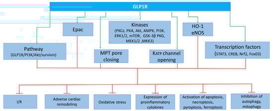 Noyan-Ashraf et al. found that a course of administration of the GLP1R agonist liraglutide to mice causes phosphorylation (activation) of Akt and HO-1 in mice with permanent CAO [44]. At the same time, there is an inactivation of GSK-3β and increased Nrf2 expression [44]. Liraglutide upregulated the expression of peroxisome proliferator-activated receptor (PPAR)-β/δ [44]. The activation of this receptor promoted an increase in cardiac tolerance to I/R [144]. In studies performed in isolated cardiomyocytes subjected to H/R, GLP-1(9–36)amide and exendin-4 increase cell survival [46]. Both peptides increased the cAMP level in cardiomyocytes and induced phosphorylation (activation) of Akt, ERK1/2, and transcription factor cAMP response element-binding protein (CREB) [46]. Akt and ERK1/2 inhibitors reversed the cytoprotective effect of GLP1R agonists [46]. LY294002, a PI3K inhibitor, abolished the infarct-limiting effect of exendin-4 [82].