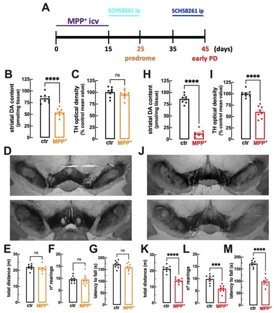 Rats challenged with an intracerebroventricular (icv) infusion of MPP+ (0.15 mg/kg/day) for 15 days displayed initial striatal toxicity without modifications of nigra neurodegeneration or motor deficits (after 10 days) followed by delayed nigra neurodegeneration and motor deficits (after 30 days): (A) Time course of experimental manipulations and analyses. At day 25 (10 days after stopping MPP+-icv infusion), compared to vehicle-infused rats (control—ctr, black bars), rats infused with MPP+ (orange) displayed decreased dopamine (DA) levels in the striatum (B) without modification either of tyrosine hydroxylase (TH) immunoreactivity in the nigra (C), as illustrated by the similar staining in vehicle-infused (D, top, 10× objective) and MPP+-infused (D, bottom, 10× objective), or of the total distance traveled in the open field (E), or of the number of rearing in the open field (F) and the latency to fall in the rotarod test (G). At day 45 (30 days after stopping MPP+-icv infusion), compared to vehicle-infused rats (control—ctr, black bars), rats infused with MPP+ (red) displayed a larger decrease in DA levels in the striatum (H) together with a reduction in TH immunoreactivity in the nigra (I), as illustrated by the similar staining in vehicle-infused (J, top, 10× objective), but decreased ipsilateral staining in MPP+-infused (J, bottom, 10× objective), as well as a decreased total distance traveled in the open field (K), a decreased number of rearing in the open field (L), and a shorter latency to fall in the rotarod test (M). Data are mean ± SEM; n = 8 mice per group; *** p < 0.001, **** p < 0.0001, Student’s t-test with Welsh correction; ns: nonsignificant (p > 0.05).