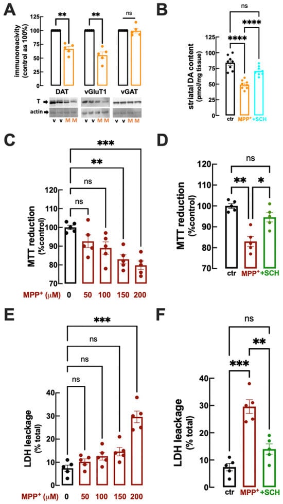 Rats challenged with an intracerebroventricular (icv) infusion of MPP+ (0.15 mg/kg/day) for 15 days displayed a loss of markers of dopaminergic and glutamatergic, but not GABAergic synapses, and this MPP+-induced striatal synaptotoxicity was attenuated by the A2AR antagonist SCH58261: (A) At day 25 (10 days after stopping MPP+-icv infusion), compared to vehicle-infused rats (black bars), rats infused with MPP+ (orange) displayed a decreased density of dopamine transporters (DATs) and vesicular glutamate transporter type 1 (vGluT1) but not vesicular GABA transporters (vGATs) in striatal membranes, as illustrated in the bar graph with average values and in the representative Western blot of DATs (top raw left, MW of 62 kDa), vGluT1 (top raw center, MW of 68 kDa) and vGATs (top raw right, MW of 57 kDa), normalized by re-probing with β-actin (lower raws, MW of 42 kDa), comparing controls (v-vehicle) with MPP+-challenged rats (M). (B) The daily administration of SCH58261 (0.1 mg/kg/day, i.p.) from day 15 to 24 (light blue bar and symbols; see time course in Figure 1A) attenuated the MPP+-induced decrease in dopamine (DA) levels in the striatum observed at day 25 (red bar and symbols). (C–F) Compared to control (ctr, no drugs), MPP+ (dark red bars and symbols) caused a concentration-dependent decrease in functionality, assessed as a reduction in MTT (C), and of the viability, assessed as the release of lactate dehydrogenase (LDH, E) and striatal synaptosomes, which were both prevented by 50 nM SCH58261 (D,F; green bar and symbols). Data are mean ± SEM; n = 5 mice per group in (A,C–F) and n = 8 mice per group in (B); * p < 0.05, ** p < 0.01, *** p < 0.001, **** p < 0.0001, Student’s t-test with Welsh correction in (A) and one-way ANOVA followed by Tukey post hoc tests in (B–F); ns: nonsignificant (p > 0.05).