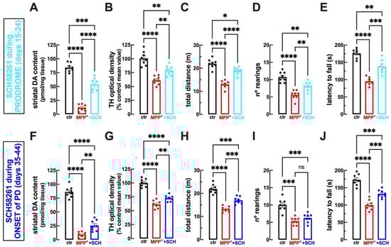 Blockade of A2AR during the prodrome of PD afforded more robust neuroprotection and alleviation of motor deficits than A2AR blockade during the onset of PD. As illustrated in the schematic time course of the experiments depicted in Figure 1A, rats were challenged with an intracerebroventricular (icv) infusion of vehicle (control-ctr, black bars, and symbols) or MPP+ (0.15 mg/kg/day) for 15 days and then treated with vehicle (red bars and symbols) or with the A2AR antagonist SCH58261 (0.1 mg/kg/day, i.p.) either during the prodromic phase (from day 15 to 24; top raw, (A–E), light blue bars and symbols) or during the onset of PD (from day 35–44; bottom raw, (F–J), dark blue bars and symbols). Rats were analyzed on day 45, first evaluating their behavior and, after sacrifice, their dopamine (DA) neurochemical profile in the striatum and tyrosine hydroxylase (TH) immunoreactivity in the substantia nigra: (A,F) striatal dopamine levels; (B,G) TH immunoreactivity in the substantia nigra; (C,H) total distance traveled in the open field; (D,I) number of rearing events in the open field test; (E,J) latency to fall in the rotarod test. Data are mean ± SEM of 8 mice per group; * p < 0.05, ** p < 0.01, *** p < 0.001, **** p < 0.0001, one-way ANOVA followed by Tukey post hoc tests; ns: nonsignificant (p > 0.05).