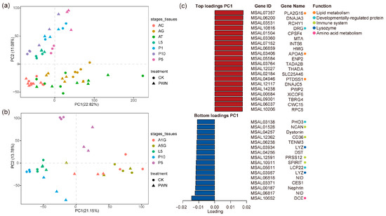 Principal component analysis (PCA) analysis unveiled distinct patterns contingent upon both developmental stage and tissue response to the PWN in M. saltuarius. The first PCA distinctly segregated the transcriptomes based on developmental stages (Figure 2a). Differential responses to PWN were observed between early stage (larvae and pupae) and late stage (adult) specimens. The second principal component highlighted various stages exhibiting notable distinctions (Figure 2b), with some stages showing clear separation along PC1. Pupae P5 and P10 exhibited contrasting reactions to adult A1G and A5G, potentially leading to varied responses in the pupal stage and adult gonads. We examined the genes primarily responsible for the segregation observed on the second PC1 (Figure 2c). Lipid metabolism and growth and development-related genes, including apolipoproteins in phospholipase and PPAR signaling pathways, were linked to positive PC1 values, whereas immunity and lysozyme genes were associated with negative PC1 values. The results showed that M. saltuarius may have different response patterns to PWN. The findings indicated that M. saltuarius could exhibit diverse response patterns towards PWN.
