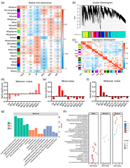 WGCNA analysis and enrichment analysis of M. saltuarius. (a) Module-trait associations. Each row corresponds to a module. Each column corresponds to a developmental stage. A high degree of correlation coefficient is indicated by dark red or dark blue. The scale on the right represents the correlation range from positive (red, 1) to negative (blue, −1). (b) Cluster dendrogram showed 22 co-expression modules identified by WGCNA, which were represented by different colors. (c) Hierarchical clustering dendrogram and heatmap of the correlated eigengenes between developmental stages and the PWN. ME, module eigengene. (d) The gene expression patterns in hub MEsalmon modules. (e) The gene expression patterns in hub MEred modules. (f) The gene expression patterns in hub MEdarkred modules. (g) GO enrichment analyses of genes involved in MEsalmon module eigengenes. (h) KEGG enrichment analyses of genes involved in module eigengenes.