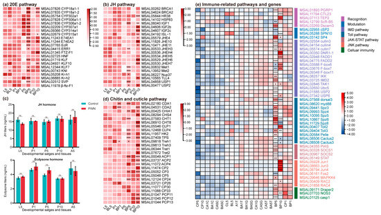 Expression profiles of DEGs and hormone concentration involved in metamorphosis. (a) Heatmap of the genes related to ecdysone. (b) Heatmap of the genes related to JH. (c) Effects of PWN on hemolymph ecdysone and JH concentration in beetles at different developmental stages. Values are expressed as mean ± SEM of three independent experiments. (d) Heatmap of the genes related to chitin and cuticle biosynthesis. (e) Heatmap of the genes related to immune response related to recognition, signaling pathways, and effectors. * p < 0.05 versus control, ** p < 0.01 versus control, and *** p < 0.001 versus control.
