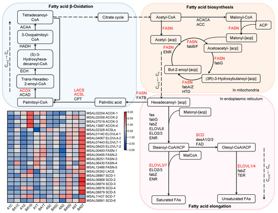 To elucidate the impact of the PWN on lipid metabolism, we employed genome sequencing to identify genes associated with fatty acid synthesis, elongation, and oxidation in the transcriptome (Figure 5). We found that the Acyl-CoA oxidase (ACOX) genes, related to fatty acid oxidation, were significantly expressed in the gonads of emerging adults. This may be related to the energy requirement of metamorphosis development in the early stages of eclosion. Fatty acid synthetase (FASN), involved in fatty acid synthesis, exhibited significant up-regulation in the gonads and trachea, in line with the expression of ELOVL and SCD, essential for fatty acid elongation (Table S9). ELOVL are used to synthesize very-long-chain fatty acids, while desaturase initiates the conversion of monounsaturated fatty acids (MUFAs) to polyunsaturated fatty acids (PUFAs). These findings suggested that FAs, specifically MUFAs or their related genes, may play a critical role in the resistance of M. saltuarius to the PWN. PWN may induce lipid metabolism in M. saltuarius, which increases energy consumption and reduces the starvation resistance.