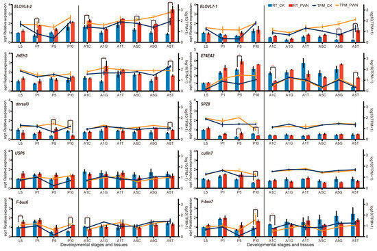 RT-qPCR was performed to validate the transcriptome analysis. Ten crucial DEGs participating in hormone, immune, and lipid metabolism were selected (Figure 6). E74EA2 and JHEH3 were associated with hormone synthesis and played a role in the growth and development of M. saltuarius. Compared with the control group, the expression levels of E74EA2 and JHEH3 were higher at the L5 stage. There were significant differences at the P5 and P10 stages, which were similar to the transcript results. Gene dorsal3, Spz8, USP6, Cullin7, F-Box6, and F-Box7 were associated with immune response. The results showed that genes in IMD (F-Box6, F-Box67, USP6, Cullin7) and Toll (Spz8, dorsal3) pathways maintained high levels at the P5 and P10 stages of beetle inoculation with the PWN. However, they were down-regulated or kept at normal levels at the A1 and A5 stages. These results indicated that the immune response to the PWN was significantly induced at the pupal stage, while most had no significant changes at the adult stage. ELOVL4-2 and ELOVL7-1 were key genes involved in fatty acid elongation and synthesis. They were expressed at low levels in the A1 stages and reached a significant expression peak in the A5 stages. In different tissues, the most significant expression was found in the trachea, followed by the gonad. There was no significant difference in the cuticle.