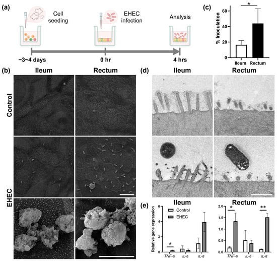 Infection of bovine ileal and rectal organoid-derived monolayers with EHEC. (a) Schematic depicting experimental timeline from generation of monolayers to infection with EHEC. Three-dimensional organoids were dissociated into single cells and seeded on to a cell culture insert to generate a confluent monolayer approximately 3–4 days prior to the experiment. A stable monolayer was infected with EHEC at time 0 and co-cultured for 4 h prior to analyses. Created with BioRender.com. (b) Representative scanning electron microscopy (SEM) images of control and EHEC-infected monolayers demonstrated bacterial adherence to the apical surface of the epithelium and extruded mucus. Scale bars, 10 μm. (c) Quantification of adhering bacteria on the apical surface of the monolayers observed in SEM images revealed preferential colonization of EHEC to the rectum over the ileum. Five independent fields of view from three independent experiments using three biological replicates were analyzed. Data are expressed as the mean ± sem. * p < 0.05. (d) Representative transmission electron microscopy (TEM) images of control and EHEC-infected monolayers demonstrated perturbation and effacement of microvilli in ileal and rectal monolayers upon infection with EHEC, respectively. Scale bar, 1 μm. (e) RT-qPCR of control and EHEC-infected monolayers documented upregulation of TNF-a and IL-8, but not IL-6, genes in EHEC-infected monolayers at 4 h. Relative gene expression levels were calculated using GAPDH, RPL0, and ACTB as the internal control. Two technical replicates from three biological replicates were evaluated. Data are expressed as the mean ± sem. * p < 0.05, ** p < 0.01.