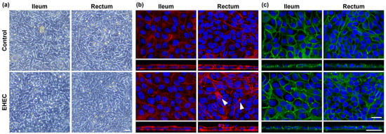 The impact of EHEC on epithelial integrity was assessed with phase contrast and confocal microscopy. Overall, phase contrast microscopy analysis confirmed that both ileal and rectal monolayers remained intact at 4 h post infection with EHEC (Figure 2a). However, immunofluorescence staining against F-actin revealed actin filament remodeling and apical membrane perturbation in EHEC-infected rectal monolayers as reported previously [] (Figure 2b). Similar changes were not readily detectable in EHEC-infected ileal monolayers. The impact of EHEC on the expression of adherens junction protein, E-cadherin, actin filament, and tight junction genes was minimal upon immunofluorescence staining (Figure 2c) and RT-qPCR analysis (Supplementary Figure S2).