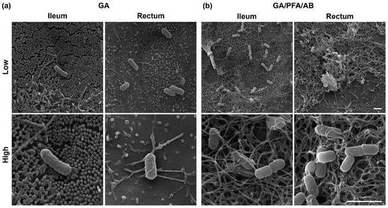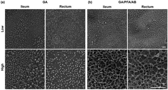 Utilizing SEM with a modified sample preparation technique, this research provided the first insight into the ultrastructure of bovine ileal and rectal mucus. While effective mucus preservation and visualization techniques have been explored extensively for histological and immunostaining evaluations [,,,], comparative studies for ultrastructural evaluations with SEM remain sparse []. The modified GA/PFA/AB-fixation technique explored in this study effectively preserved and visualized the fine net-like structure of mucus in our bovine model, which aligns with the structures seen in human and porcine intestinal mucus []. On the other hand, a conventional GA-fixation technique preserved little mucus and effectively visualized the underlying microvilli, another important target to be evaluated with electron microscopy. The study highlights the critical importance of selecting suitable fixation techniques for visualizing distinct luminal structures like microvilli and mucus. This choice of sample preparation methods is essential, depending on the specific objectives of the research.