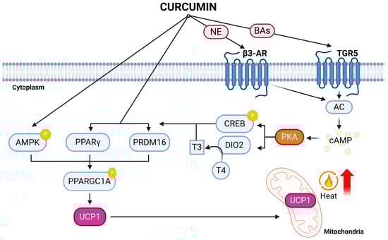 The mechanism of action of curcumin on adipose browning. Curcumin induces adipose browning through activation of UCP1 via β3-AR, TGR5, and AMPK phosphorylation. Curcumin up-regulated PPARγ, PRDM16, and phosphorylated AMPK, which in turn activated Ppargc1a and UCP1 [,,]. Additionally, curcumin exerted beneficial effects by altering gut-microbiome symbiosis and bile acids. BAs are known to activate TGR5, which triggers the production of cAMP. Activation of TGR5 through curcumin supplementation induced the phosphorylation of CREB, up-regulating UCP1-dependent thermogenesis []. Curcumin was also shown to increase the level of norepinephrine in serum upon supplementation [,]. Norepinepherine, up-regulated by curcumin, activates β3-AR, leading to the induction of DIO2 expression. Increased DIO2 enhances the conversion of T4 to T3 within adipocytes. Subsequently, T3 activates the expression of genes involved in thermogenesis, PRDM16, PPARγ, PPARGC1A, and UCP1 [,]. Overall, curcumin’s mechanism of action involves the activation of key regulators such as UCP1 through β3-AR, TGR5, and AMPK phosphorylation, alongside modulation of PPARγ, PRDM16, and AMPK phosphorylation. Ppargc1a activates mitochondrial biogenesis while UCP1 increases thermogenesis. The diagram includes key components such as norepinephrine (NE), bile acids (BAs), adenylyl cyclase (AC), 5′ AMP-activated protein kinase (AMPK), beta-3 adrenergic receptor (β3-AR), cAMP-response element-binding protein (CREB), iodothyronine deiodinase 2 (Dio2), phosphorylation (P), peroxisome proliferator-activated receptor γ coactivator-1α (PPARGC1A), protein kinase A (PKA), PR domain zinc finger protein 16 (PRDM16), peroxisome proliferator-activated receptor gamma (PPARG), thyroxine (T4), triiodothyronine (T3), Takeda G protein-coupled receptor 5 (TGR5), and uncoupling protein-1 (UCP1).
