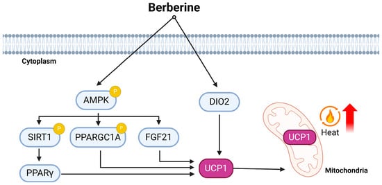 Berberine activates the AMPK signaling pathway targeting several downstream factors such as sirtuin 1 (SIRT1), Ppargc1a, and Fgf21 to display its functions [,,]. Berberine up-regulates thermogenic capacity in vitro through the activation of the AMPK-SIRT1 pathway. Studies by Xu et al. examined whether berberine induces the browning process in 3T3-L1 white preadipocytes and H1B1b brown preadipocytes []. Berberine (5 μM) exhibited the characteristics of brown-like adipocytes with increased mitochondrial density and smaller lipid droplets. In 3T3-L1 cells, berberine up-regulated the SIRT1 and UCP1 protein level along with the phosphorylation of AMPK in a dose-dependent manner []. Previous studies have demonstrated that Sirt1 plays an important role in energy metabolism and the remodeling of adipose tissues [,,]. Since Sirt1 is a downstream target of AMPK, Xu et al. postulated that berberine activates the AMPK-SIRT1 signaling axis. Silencing SIRT1 abolished berberine’s effect, suggesting an AMPK-SIRT1-dependent mechanism in regulating thermogenesis. This research concluded that berberine elevated thermogenesis, accompanied by altercations in the AMPK-SIRT1 pathway; however, the specific downstream mechanisms were unclear [].
