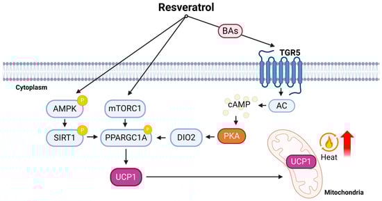 The mechanism of action of resveratrol on adipose browning. Resveratrol induces adipose browning via the activation of the mTORC1, AMPK-SIRT1, and TGR5—PPARGC1A pathways. Upon the activation of resveratrol, AMPK phosphorylates and activates SIRT1, a nicotinamide adenine dinucleotide (NAD+)-dependent deacetylase. Phosphorylated SIRT1, in turn, exerts its enzymatic activity to deacetylate and activate PPARGC1A, a master regulator of mitochondrial biogenesis and UCP1 expression. Subsequently, activated PPARGC1A promotes the transcription of UCP1, leading to the induction of thermogenesis in adipose tissue [,]. Additionally, resveratrol increases the concentration of bile acid and lithocholic acid, which in turn activates TGR5 receptor. The activation of the TGR5 receptor stimulates AC, resulting in elevated levels of cAMP. It then activates PKA, which phosphorylates and activates DIO2. Activated DIO2 enhances the expression of PPARGC1A, promoting the transcription of UCP1, facilitating thermogenesis and energy dissipation in brown adipose tissue []. The diagram includes key components such as bile acids (BAs), 5′ AMP-activated protein kinase (AMPK), cyclic adenosine monophosphate (cAMP), type 2 iodothyronine deiodinase (DIO2), adenyl cyclase (AC), the cAMP-response element-binding protein (CREB), phosphorylation (P), peroxisome proliferator-activated receptor γ coactivator-1α (PPARGC1A), sirtuin-1 (SIRT1), Takeda G protein-coupled receptor 5 (TGR5), and uncoupling protein-1 (UCP1).