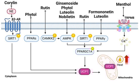 A diagram illustrating the potential mechanisms of corylin, formononetin, ginsenoside, phytol, luteolin, menthol, nobiletin, and rutin-induced adipose browning. The signaling pathways responsible for the up-regulation of UCP1 and its transcriptional regulators are depicted. Corylin induces adipose browning by activating SIRT1 and β3-AR; however, the underlying mechanisms are unknown []. Formononetin [], ginsenoside [,,,], phytol [,], and luteolin [,] induce adipose browning by activating the AMPK-PPARGC1A pathway. Menthol stimulates adipose browning through the AMPK-PPARGC1A pathway, as well as by stimulating TRPM8 [,,,]. Nobiletin [,] and rutin [,,] stimulate adipose browning by up-regulating PPARGC1a and UCP1; however, the signaling components are yet to be elucidated. The diagram includes key components such as adenylyl cyclase (AC), 5′ AMP-activated protein kinase (AMPK), activating transcription factor 2 (ATF2), beta-3 adrenergic receptor (β3-AR), cAMP-response element-binding protein (CREB), iodothyronine deiodinase 2 (Dio2), phosphorylation (P), peroxisome proliferator-activated receptor γ coactivator-1α (PPARGC1A), peroxisome proliferator-activated receptor α (PPARα), calcium/calmodulin-dependent protein kinase 2 (CAMKK2), sirtuin-1 (SIRT1), transient receptor potential cation channel subfamily M member 8 (TRPM8), and uncoupling protein-1 (UCP1).