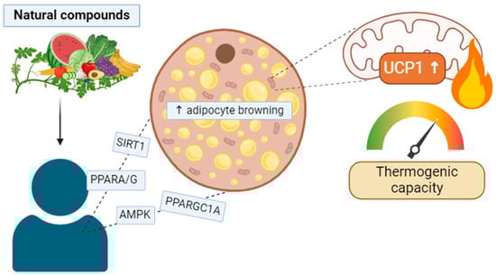 In conclusion, this review summarizes the relationship between natural compounds and adipose thermogenesis, offering a comprehensive overview of the potential mechanisms involved. The evidence presented suggests that certain bioactive compounds can induce adipose browning through various signaling pathways, including the activation of AMPK/SIRT1/PPARGC1A, the stimulation of TRPM8, the β3-AR receptor, or TGR5, and the interaction with key regulators like PRDM16, PPARGC1A, and PPARA/G. These findings underscore the therapeutic potential of natural compounds in combating obesity and related metabolic disorders via the promotion of thermogenesis in adipose tissues.
